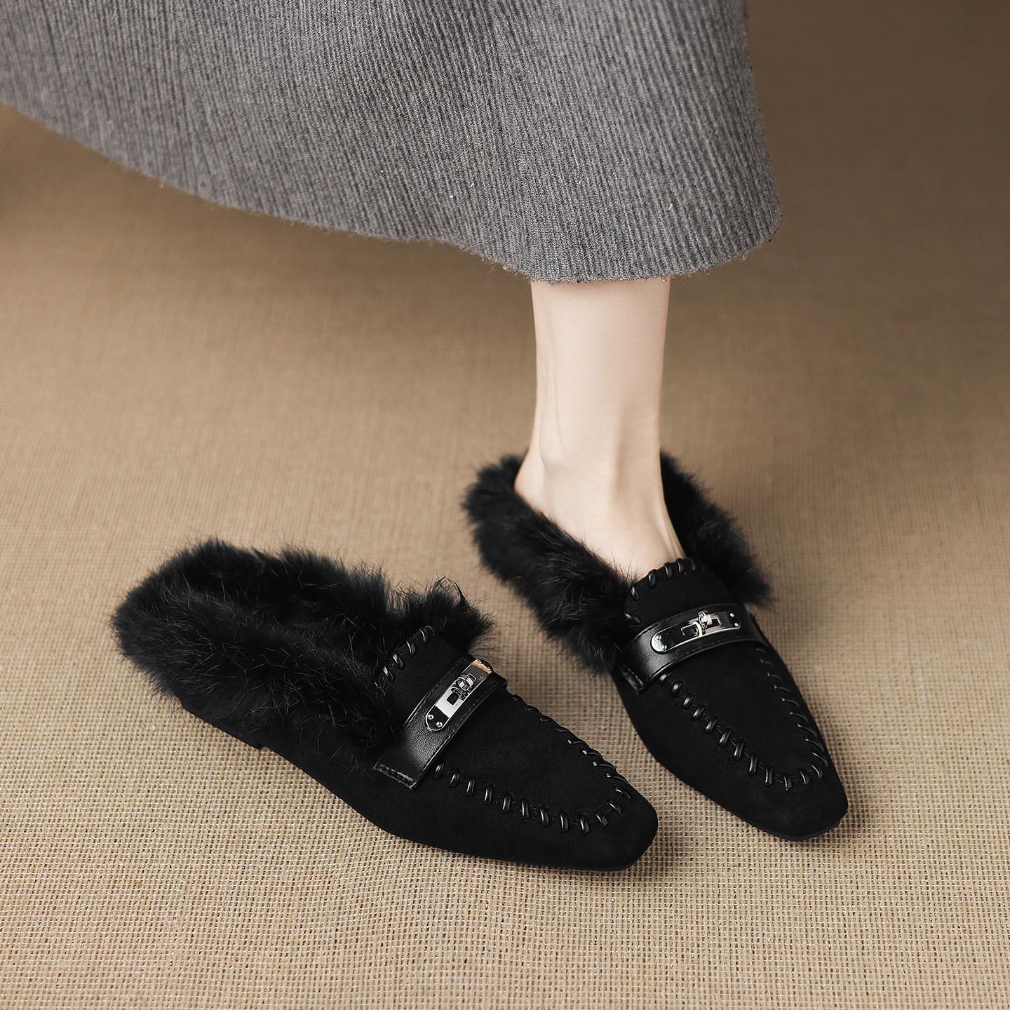 毛毛拖鞋女2025秋冬季新款外穿皮带扣休闲勃肯鞋加绒百搭平底棉鞋
