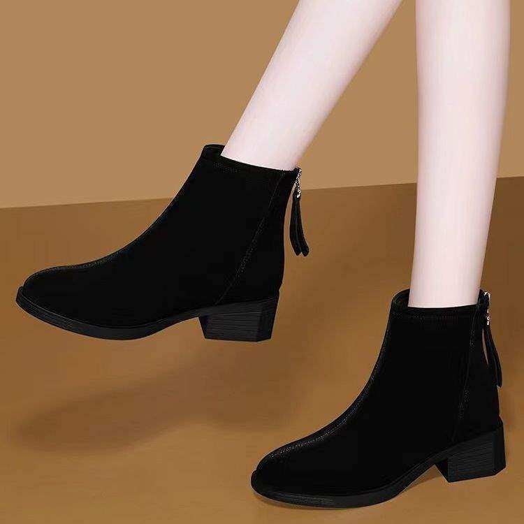 细跟绒面尖头时装靴欧美低跟加绒切尔西鞋春秋新款通勤皮鞋女