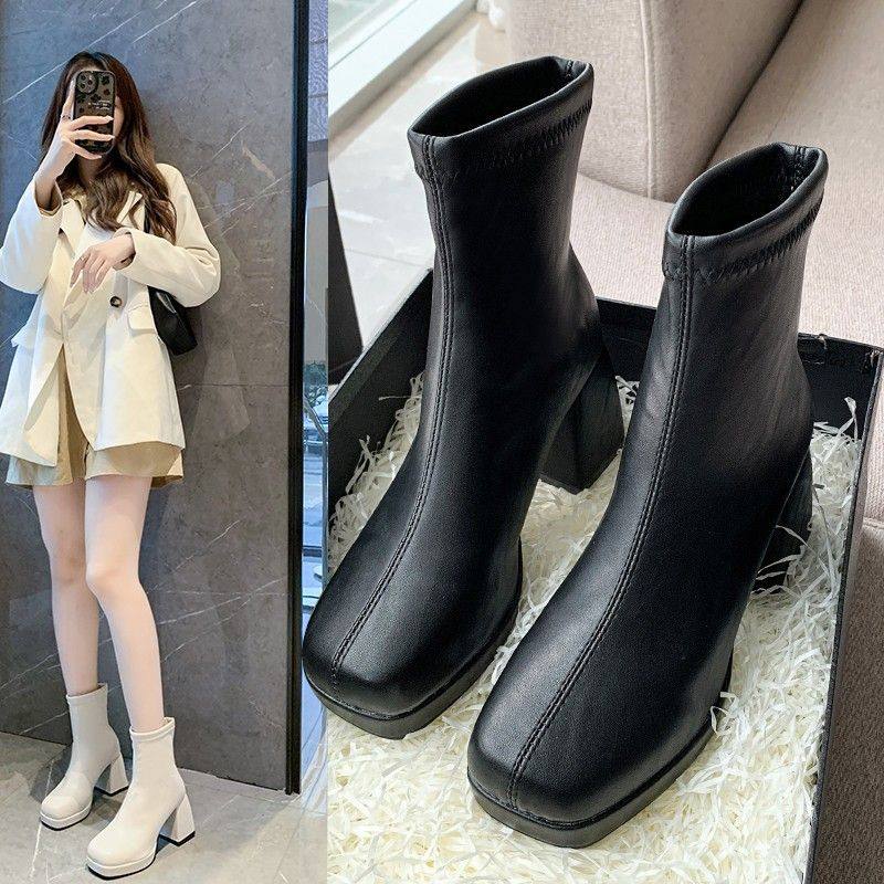 方头马丁靴女年秋冬新款粗跟高跟短筒靴防水台后拉链米色短靴