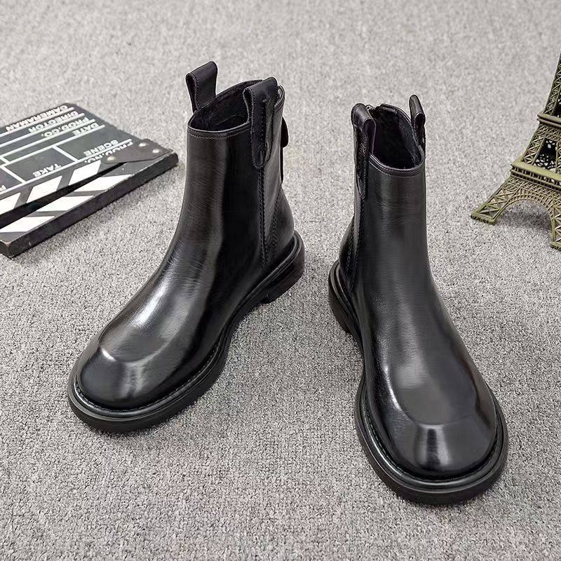 胎牛皮鹅头切尔西短靴女新款复古瘦瘦单靴漆皮平底马丁靴