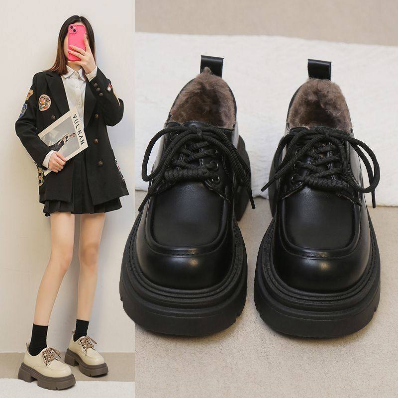 保暖增高冬季鞋子加绒米色棉鞋厚底毛毛百搭乐福鞋女复古新款高跟