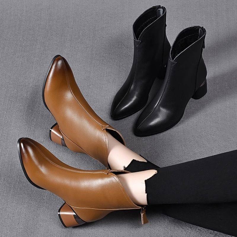 真皮短靴女秋冬季新款尖头粗跟马丁靴软皮小鱼严选高跟鞋裸靴
