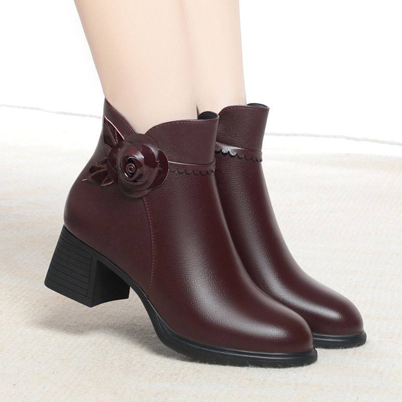 时尚靴子女2025冬季新款短靴粗跟软底耐磨妈妈皮鞋高跟不累脚皮靴