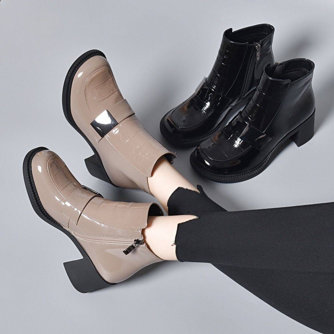 牛漆皮粗跟短靴女真皮韩版圆头短筒靴中跟加绒踝靴百搭亮皮时装靴