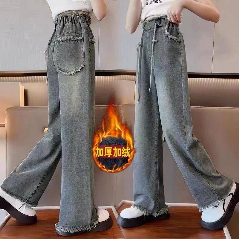 女童牛仔裤冬款新款儿童秋冬大童加绒长裤阔腿裤女孩直筒裤子