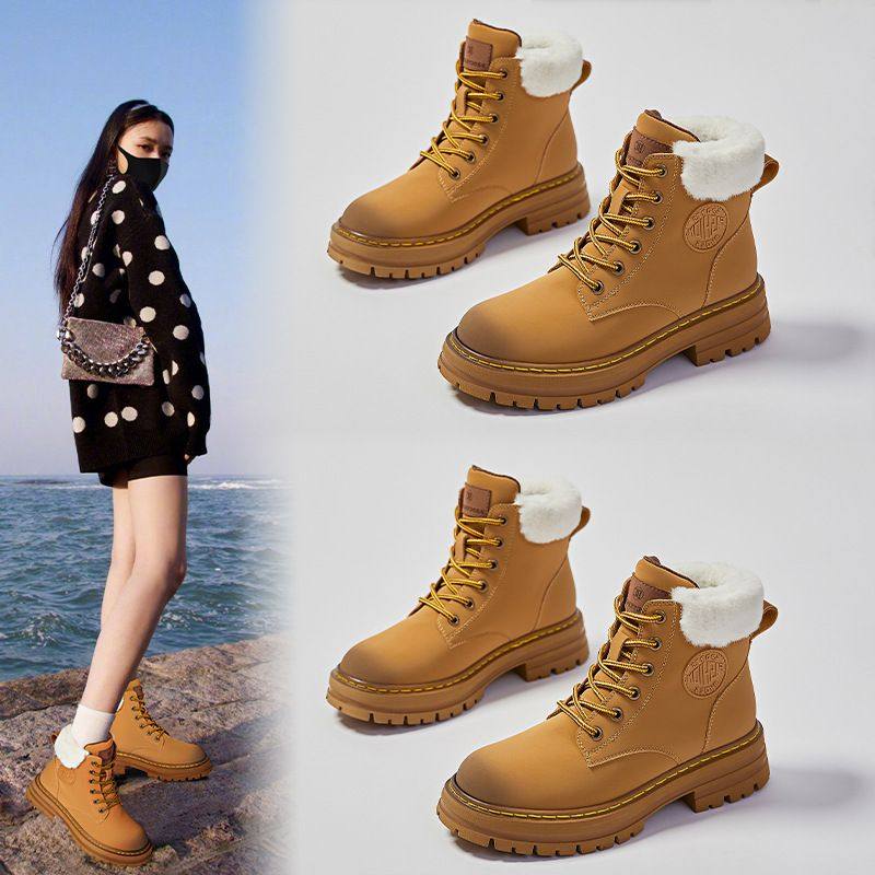 真皮大黄靴女2025冬季新款女士加绒马丁靴女圆头粗跟增高靴子女潮