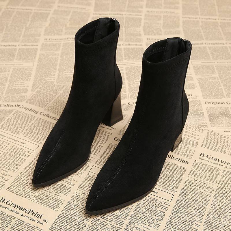 尖头短靴女2025秋冬新款粗跟瘦瘦靴时尚百搭气质后拉链时装靴现货