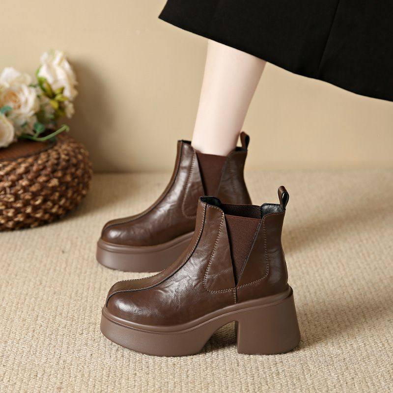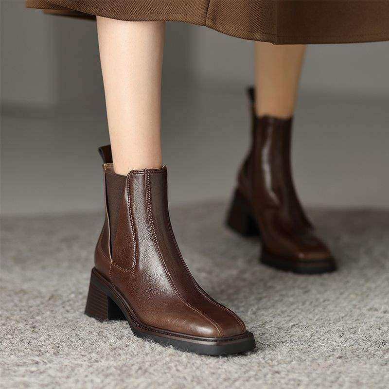 棕色复古短靴女2025秋冬新款粗跟方头切尔西靴百搭高跟显瘦马丁靴