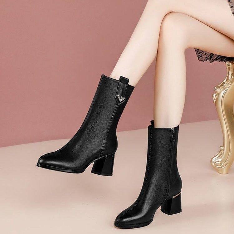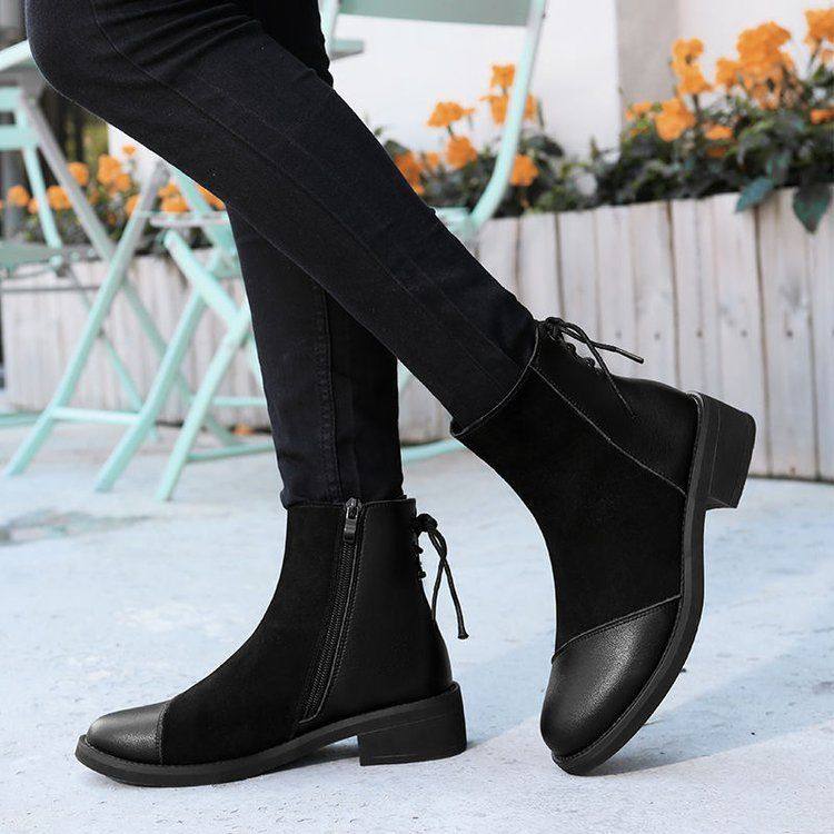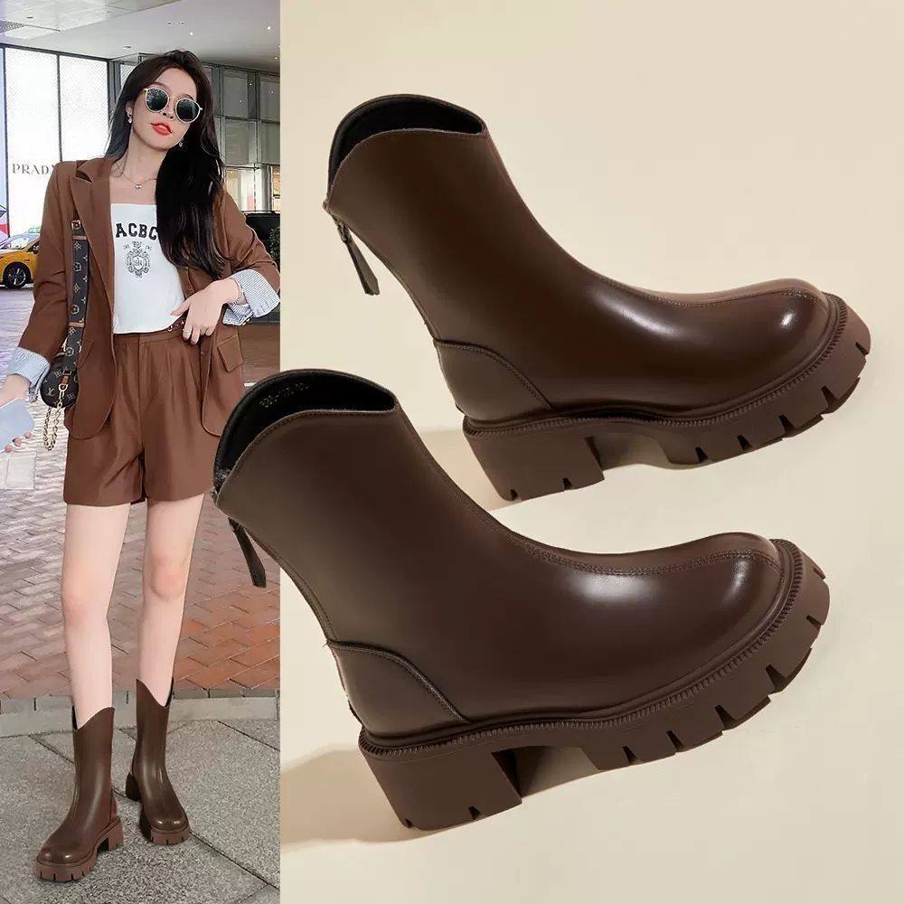 2025年秋季新款英伦风中跟短筒皮靴女方头粗跟侧拉链方头时装靴女
