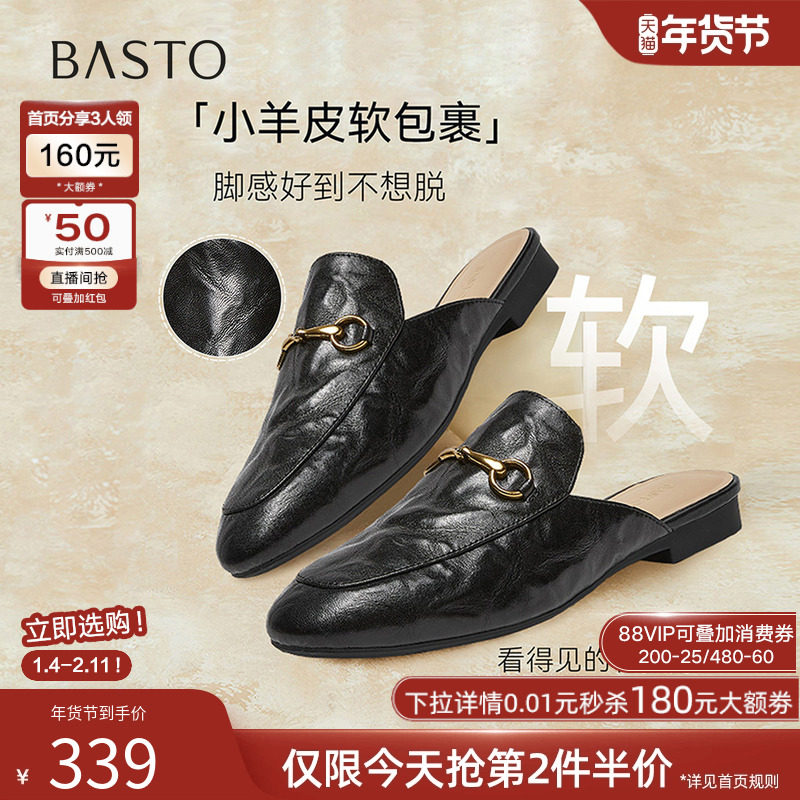 百思图2026夏季新款羊皮乐福穆勒拖粗跟女外穿包头半拖鞋C1758BH6