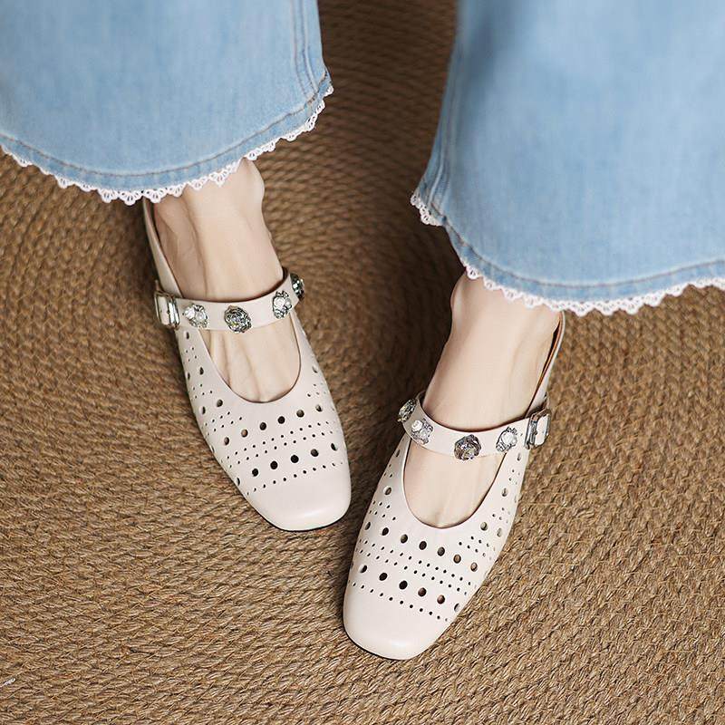 妙丽真皮镂空玛丽珍鞋2026夏季新款一脚蹬半拖鞋法式浅口单鞋女