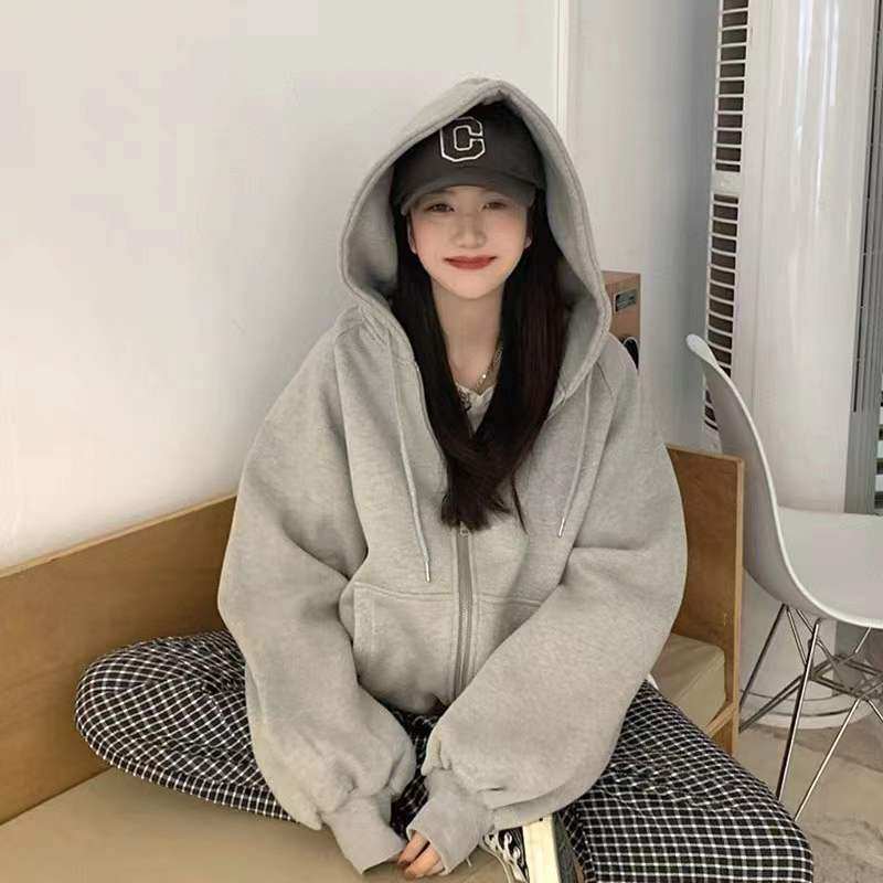 拉链连帽运动卫衣外套女春秋冬季宽松学生开衫盐系大码拉链上衣潮
