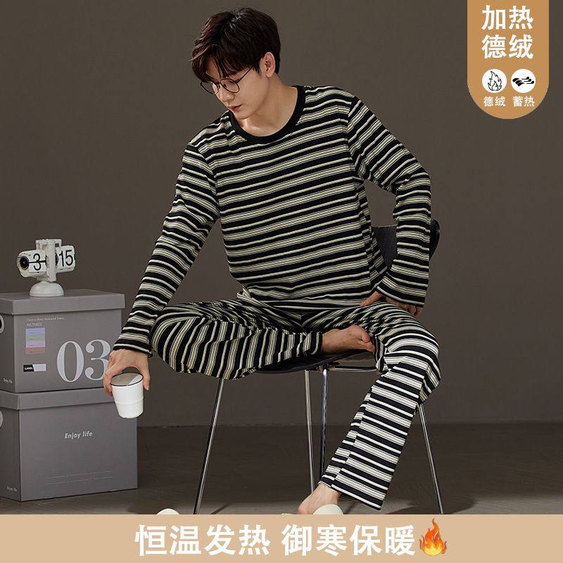 男士德绒保暖睡衣秋冬季薄绒长袖休闲套装加绒男青少年家居服外穿
