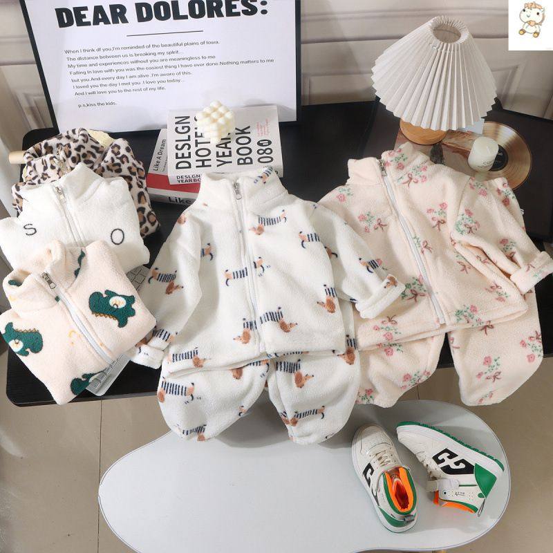 儿童家居服套装男女宝宝双面加绒加厚泡芙绒睡衣外套加保暖两件套
