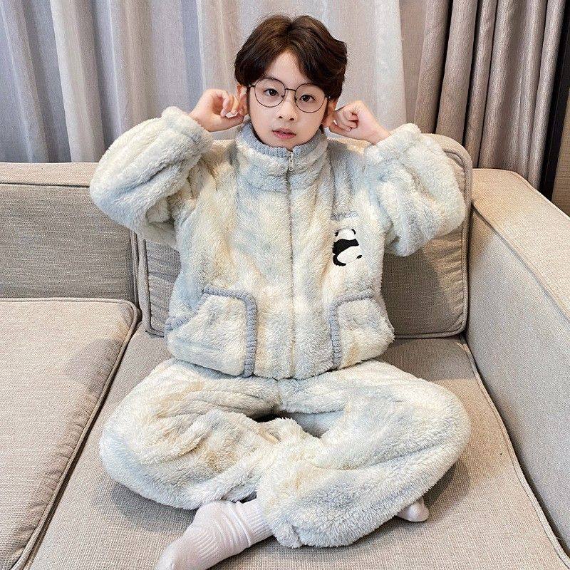 儿童睡衣秋冬季法兰绒珊瑚男童男孩套装拉链加绒加厚冬款中大小童