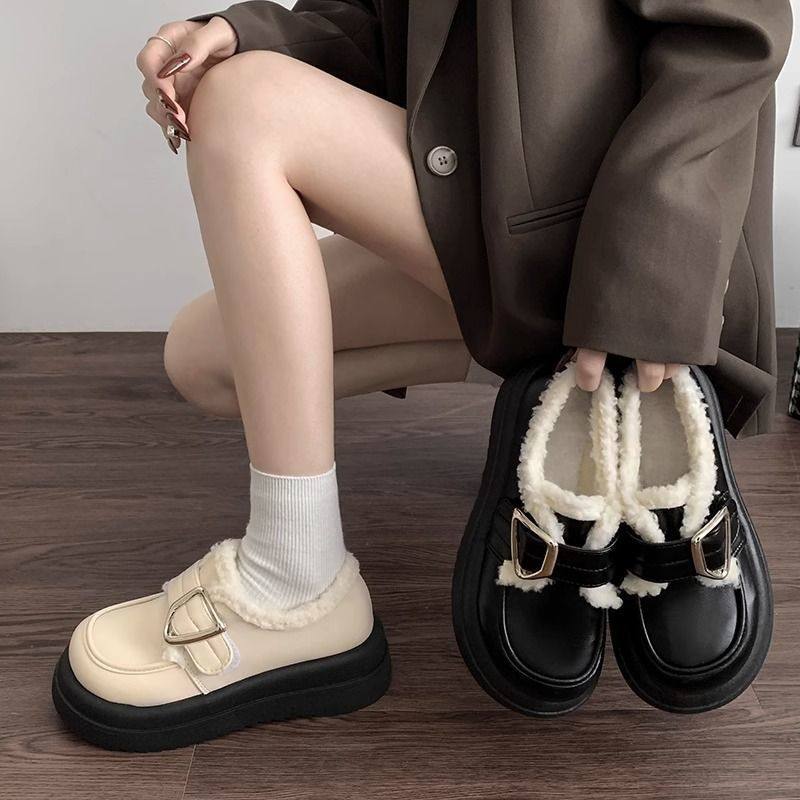 英伦风加绒保暖复古厚底小皮鞋女新款秋冬季一脚蹬法式乐福鞋