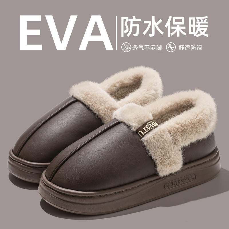 皮面防水棉拖鞋男2025新款冬季外穿防滑加绒保暖家居室内包跟棉鞋