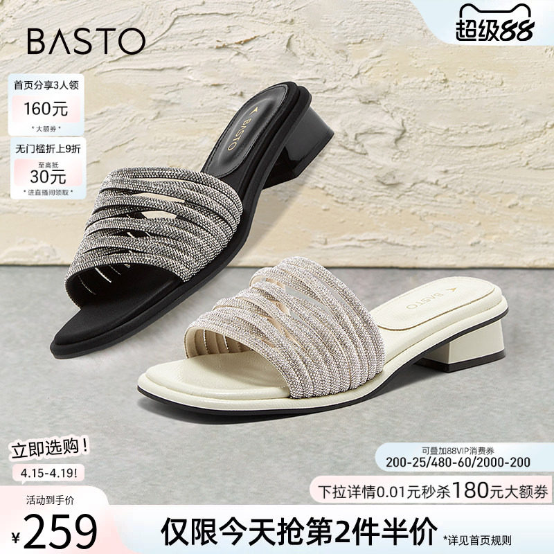 百思图夏商场新款时尚气质闪钻一字拖粗跟女外穿拖鞋A5251BT4