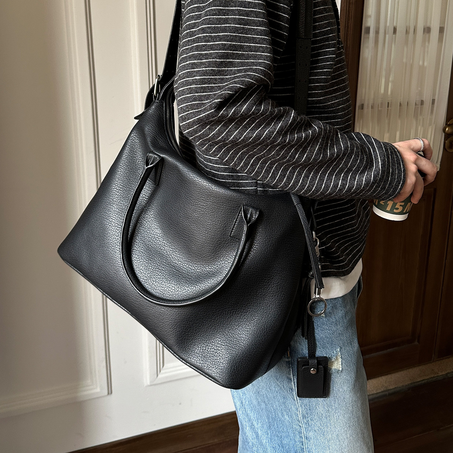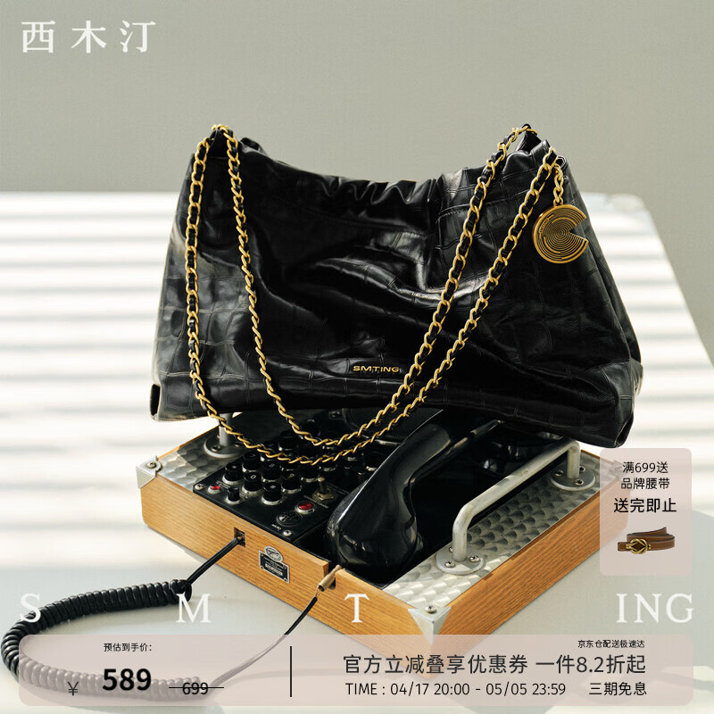 西木汀 悠途 头层牛皮包包新款小个子女托特包高级感链条包 深邃黑中号