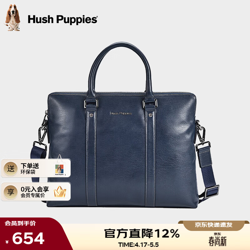 暇步士(Hush Puppies)男士公文包真皮新款双拉链大容量商务电脑包手提及单肩斜挎包礼物 蓝色 大包14英寸