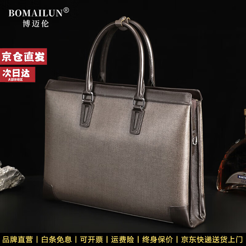 博迈伦手提包男士公文包高端真皮商务办公电脑包头层牛皮通勤出差斜挎包 啡色 39.5*8.5*29cm