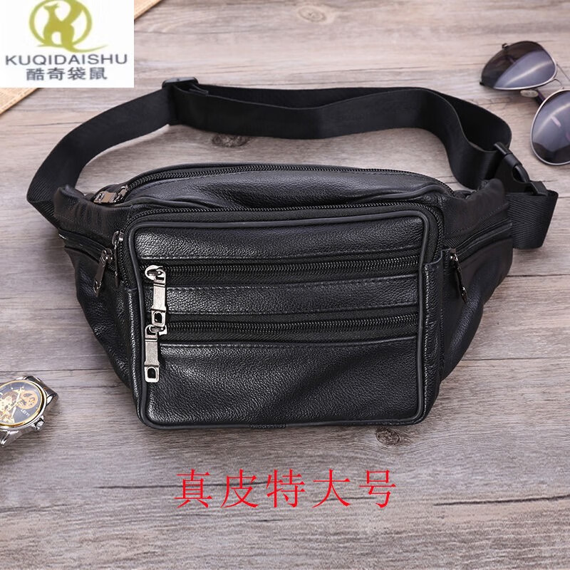 酷奇袋鼠真皮腰包男斜挎多功能防水手机包男士收银腰包大容量韩版真牛皮包 特大款-黑色