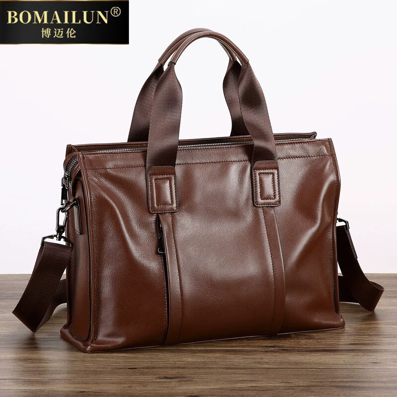 博迈伦商务公文包男真皮男士手提包通勤男包头层牛皮电脑包单肩斜挎包 棕色 有侧袋 39.5*12*27.5cm15.6英寸