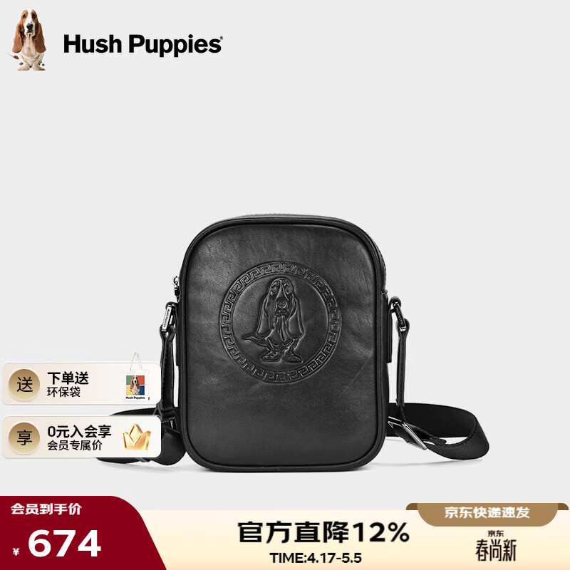 暇步士(Hush Puppies)男士单肩包真皮大容量斜挎包新款简约商务包竖款通勤旅行挎包礼物 黑色