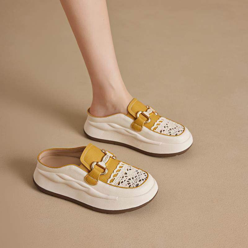 真皮包头半拖鞋女外穿2025春夏新款一脚套松糕厚底系带休闲凉拖