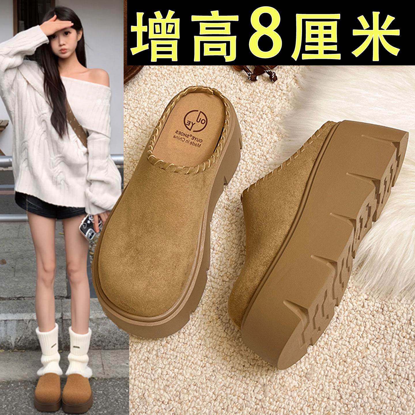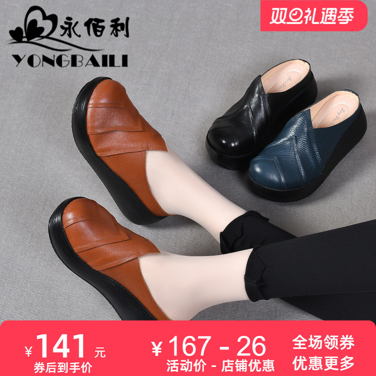 英国真皮包头半拖鞋女秋外穿2025新款一脚蹬厚底内增高勃肯鞋单鞋