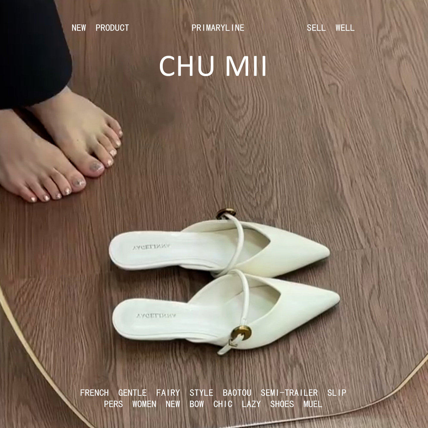 小丸子 真皮包头半拖鞋女2025夏季粗跟穆勒鞋高级感中跟尖头单鞋