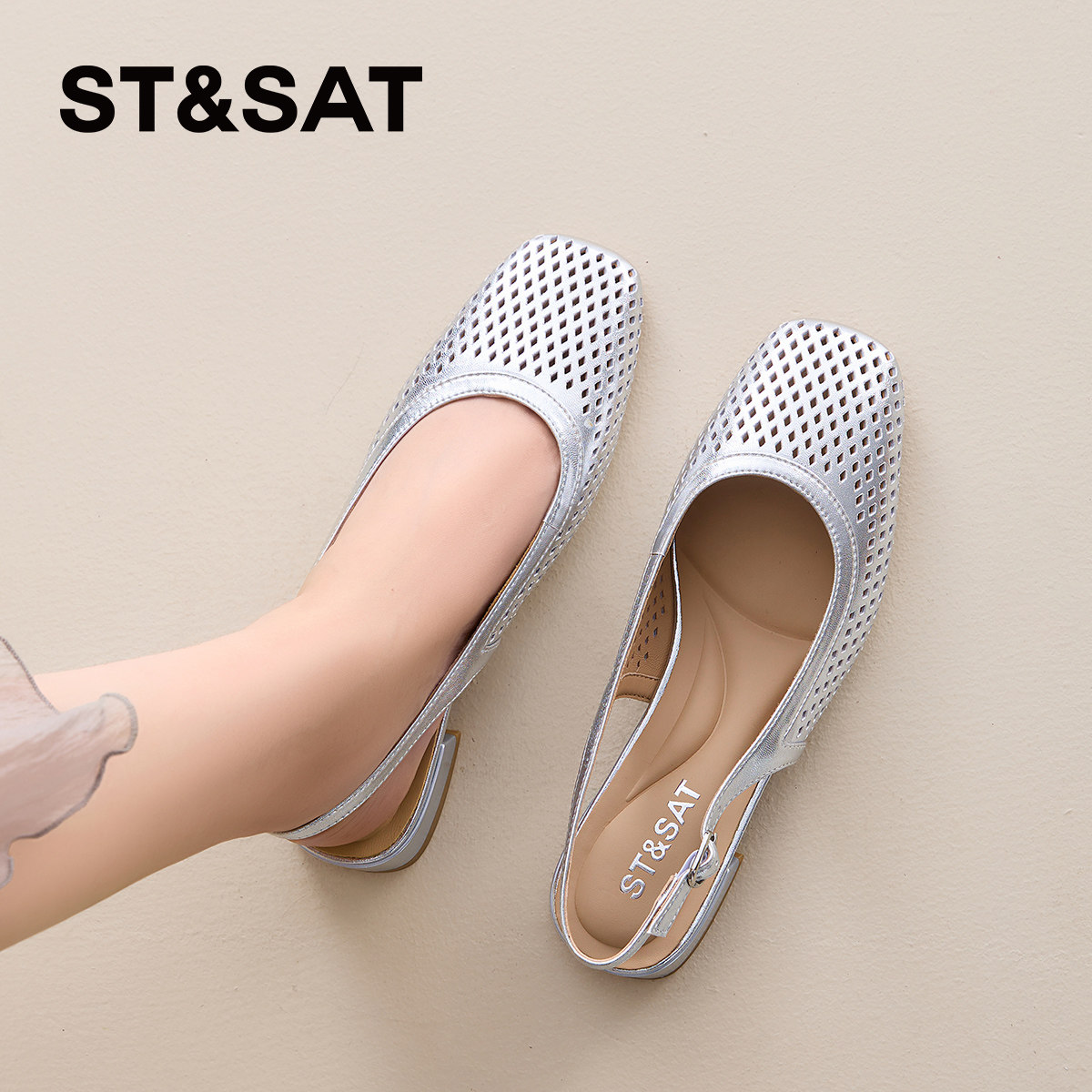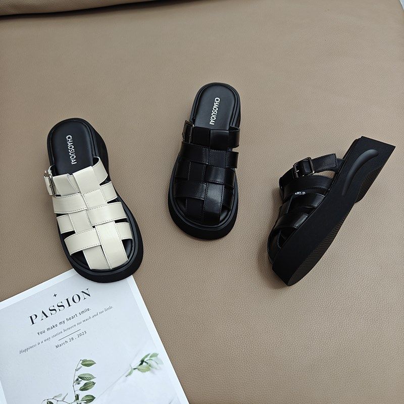 【港风系列】星期六真皮包头镂空透气夏季女凉鞋粗跟软底舒适4B1G