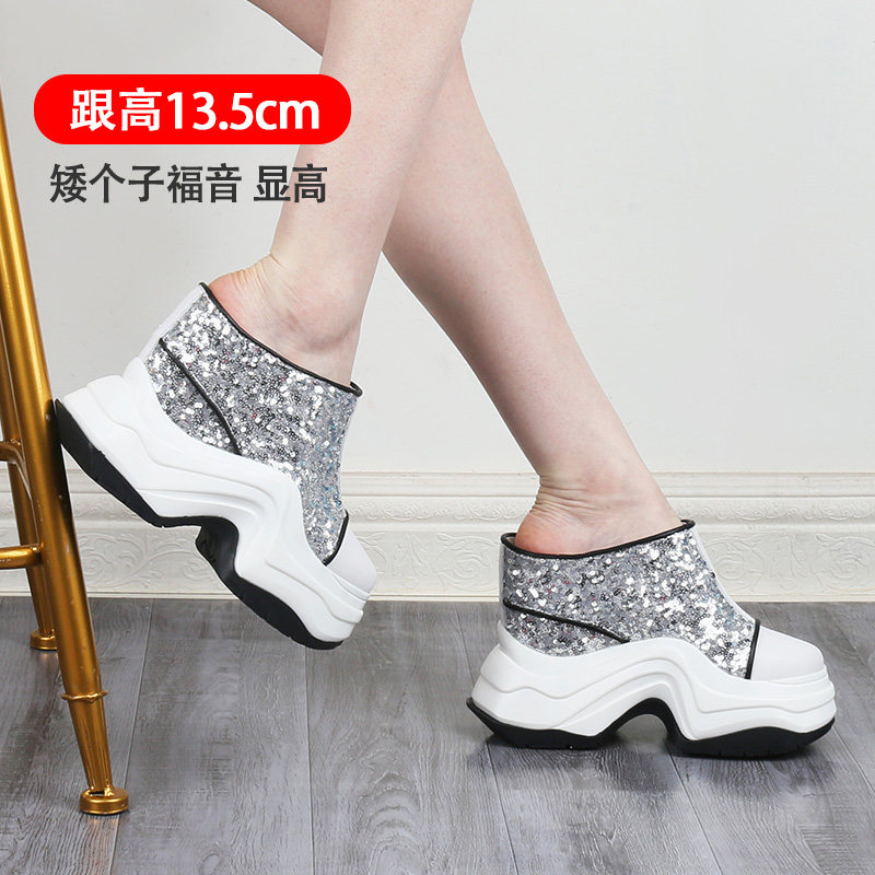 银色13cm高跟拖鞋女外穿凉鞋夏季真皮包头松糕厚底增高一字凉拖鞋