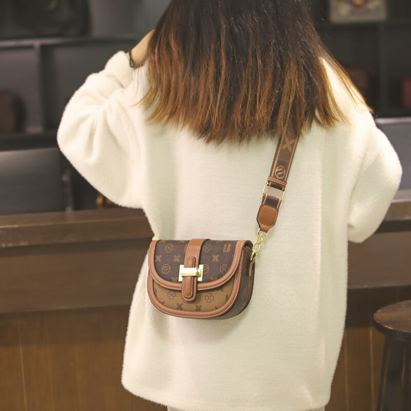 CACOD香港正品女包2026新款气质百搭真皮包潮流复古印花手提斜挎牛角包 老花配卡其色【关注店铺赠送礼品袋】