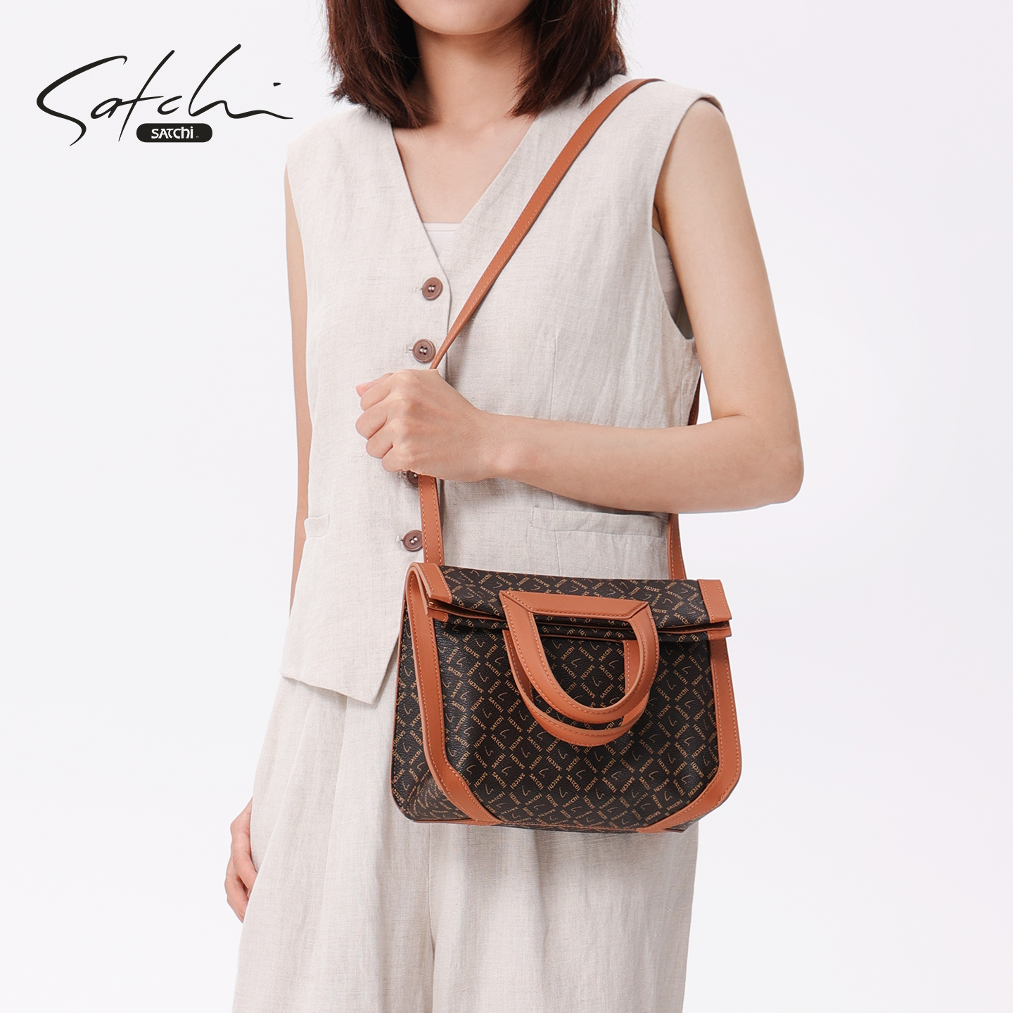 SATCHI沙驰女包老花折叠包女通勤单肩斜挎包手提包印花中性大容量公文包 啡色/棕色
