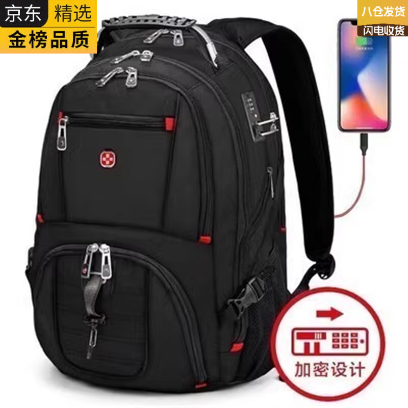 EKK德国进口品牌瑞士军士刀双肩包男大容量包商务包电脑包旅行书包初 黑色(23寸 超大号)背包自带防盗锁