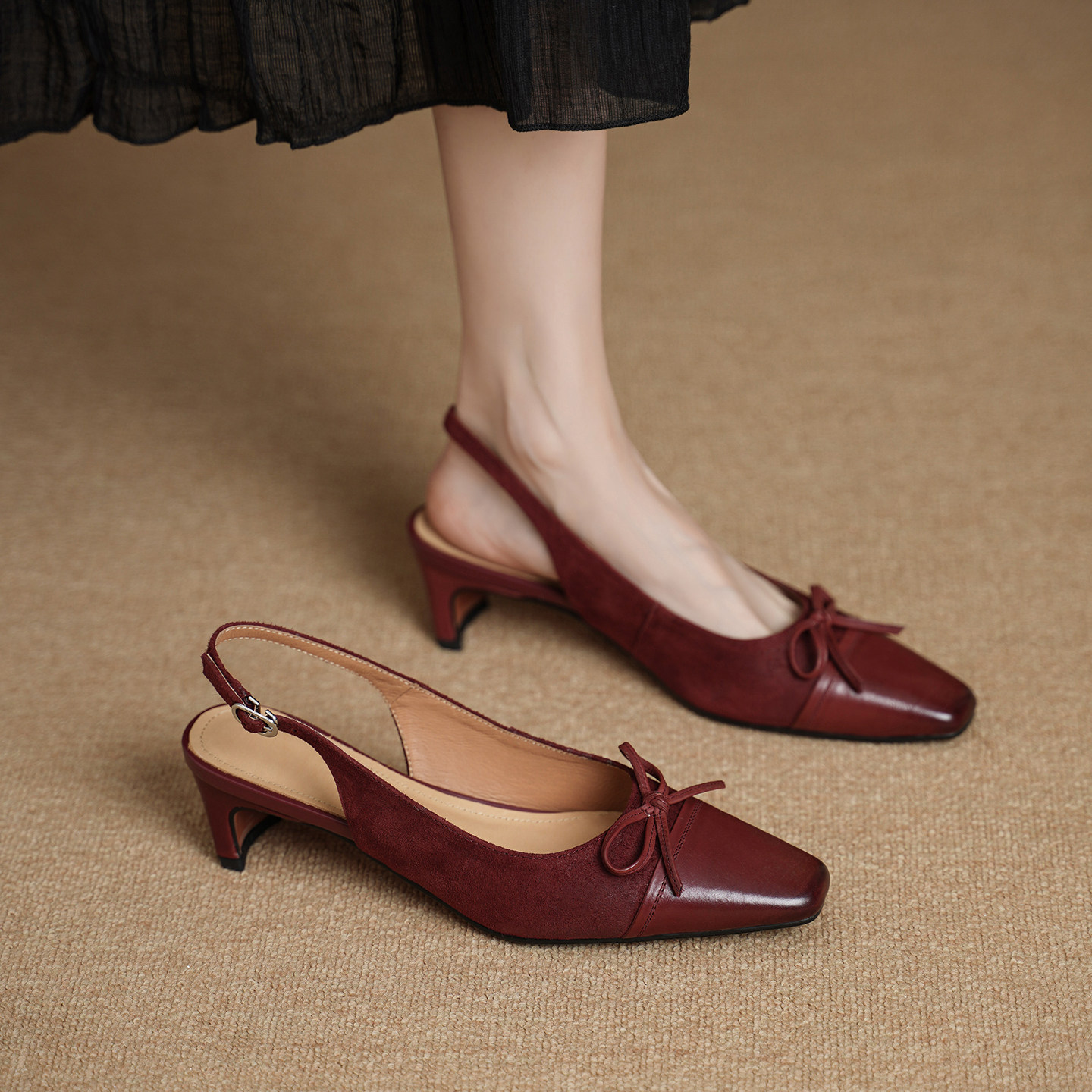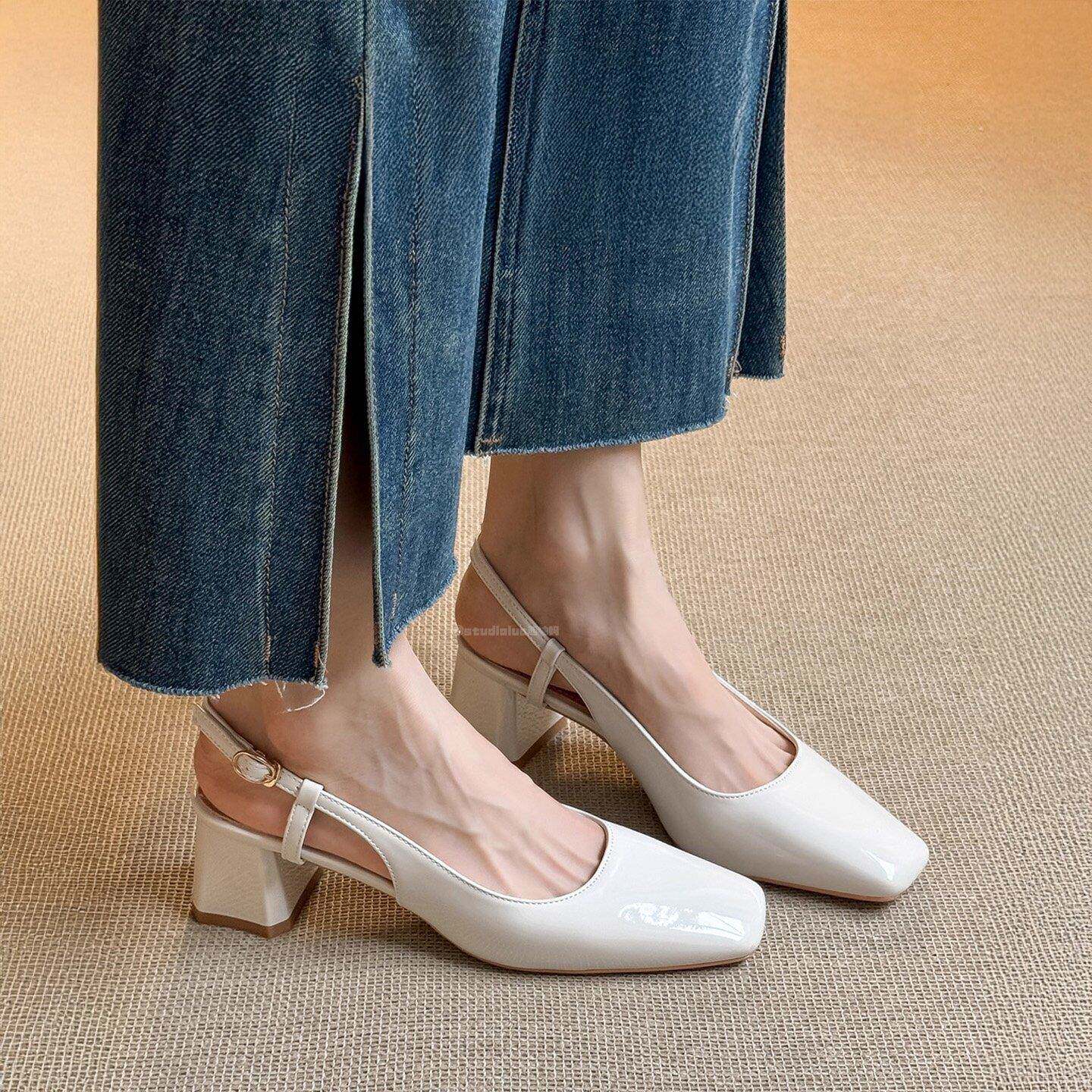 4.5cm真皮包头凉鞋女夏季外穿配裙子后空单鞋复古方头粗跟高跟鞋