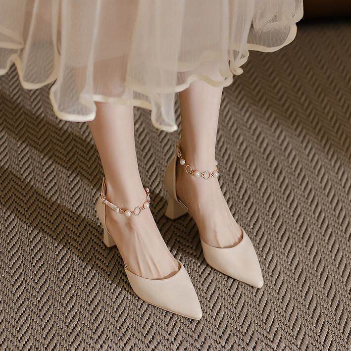 香港法式真皮包头一字扣带凉鞋女夏白色尖头平底鞋浅口高跟鞋单鞋