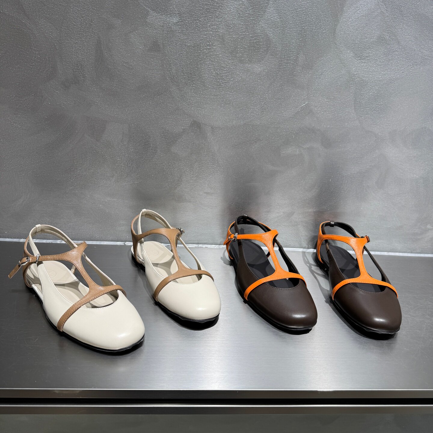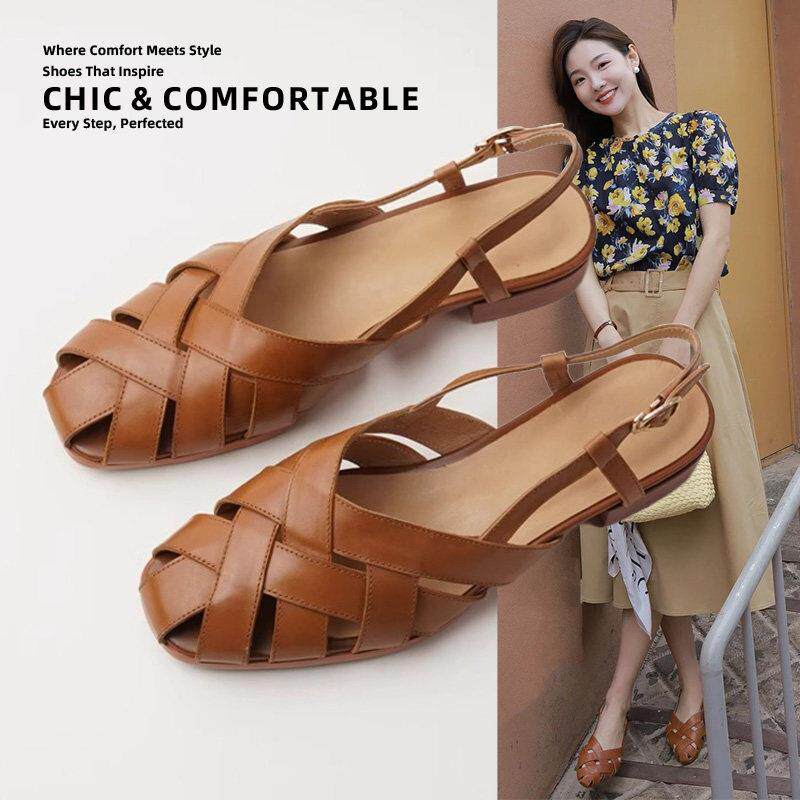 香港罗马凉鞋女2025夏款低跟真皮包头镂空圆头后空一字扣带平底鞋