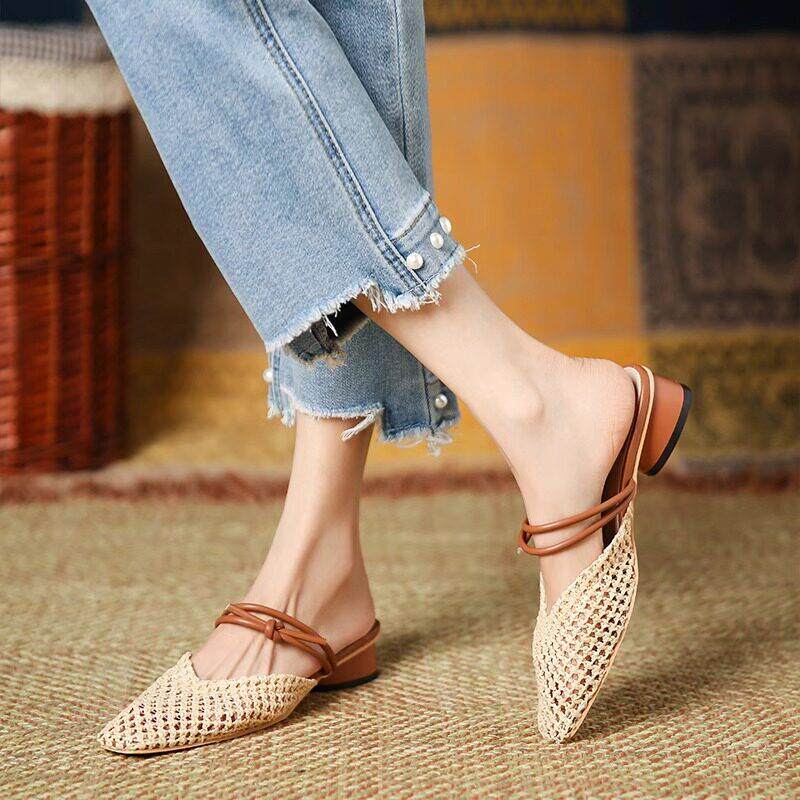 香港真皮包头半拖鞋女外穿2025夏季新款两穿法式绝美凉鞋粗跟凉拖