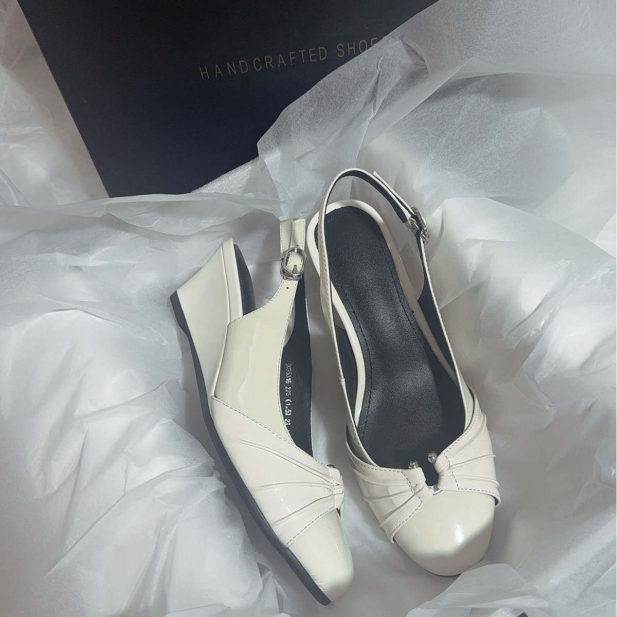 淑女网红风温柔款气质一脚蹬高跟皱皱真皮包头坡跟凉鞋