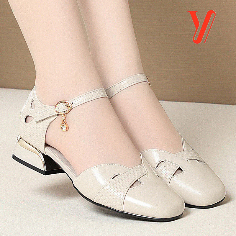 夏季真皮包头包跟凉鞋女粗跟软底舒适中老年妈妈鞋中跟女鞋