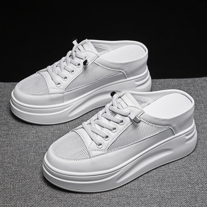 真皮包头半拖鞋女2025新款夏季凉鞋网面小白鞋厚底百搭外穿凉拖鞋