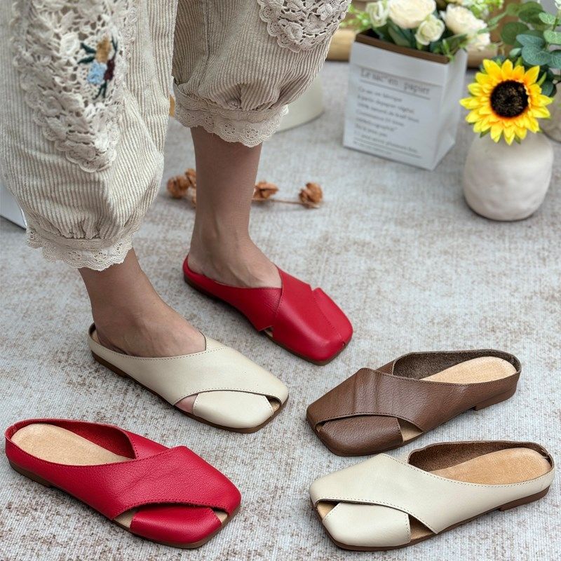 手工真皮包头半拖鞋女复古夏季外穿透气凉鞋一脚蹬女鞋孕妇平底鞋