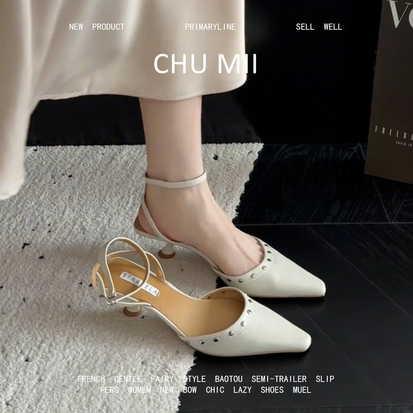 羊皮版!时髦铆钉真皮包头凉鞋女绝美方头高跟鞋后绑带细跟高跟鞋