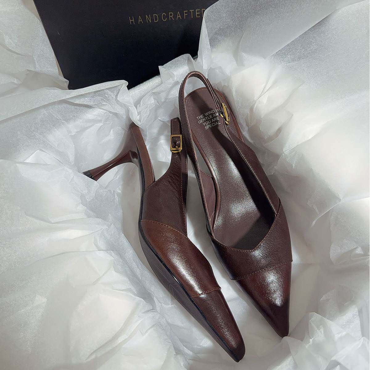 温柔百搭尖头真皮包头凉鞋高跟一脚蹬后拉细跟舒适女鞋