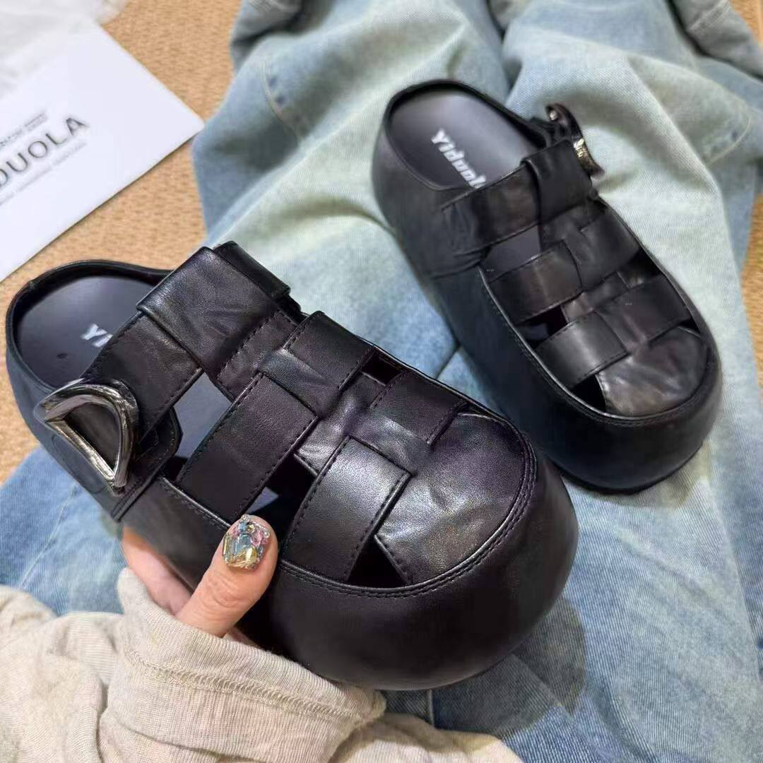 2026夏季新款真皮包头拖鞋女厚底增高猪笼鞋