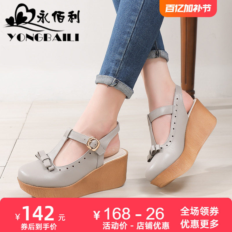 夏季罗马坡跟T字带凉鞋女士真皮包头厚底复古镂空百搭女鞋皮鞋