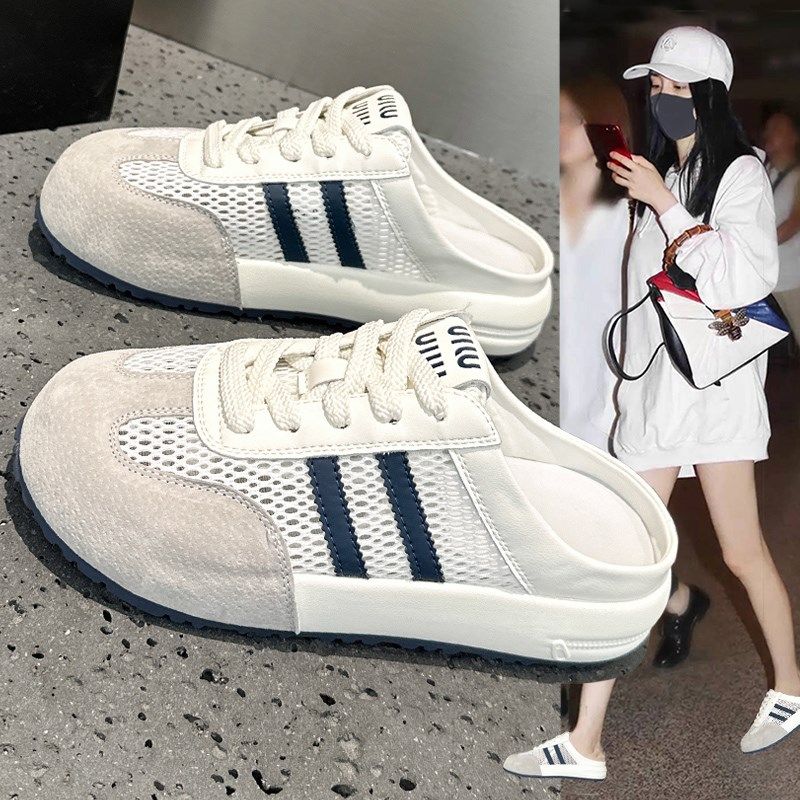 夏季真皮包头半拖鞋女外穿2025新款爆款软底透气网面德训小白鞋子