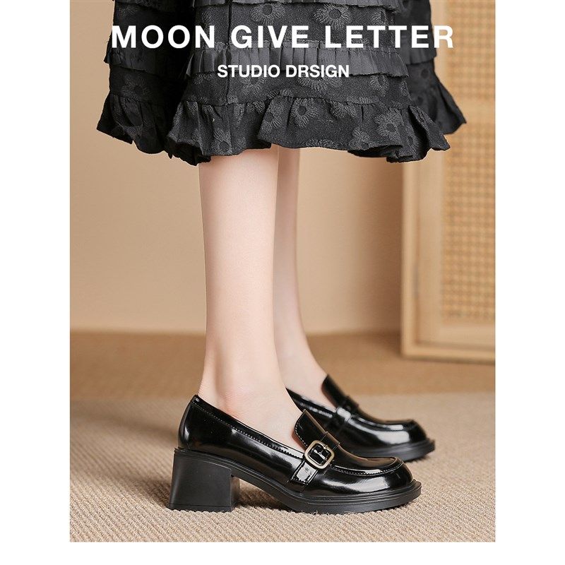 小啰同学真皮包鞋女2023春季新款金属扣粗跟高跟英伦风小皮鞋女